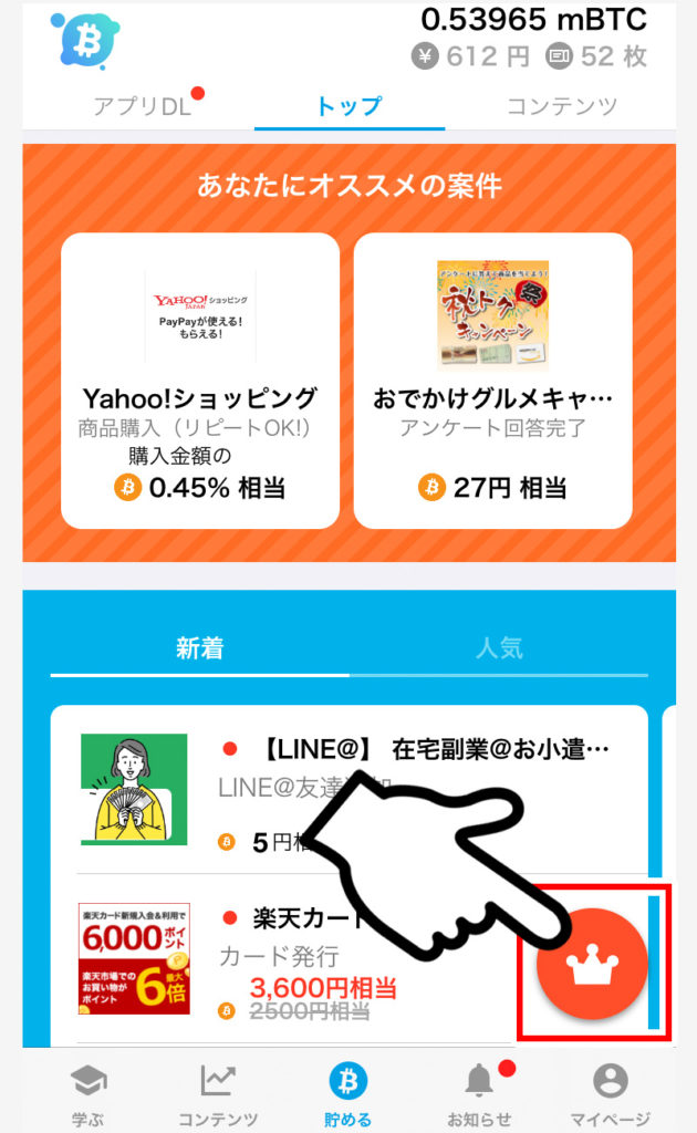 早く貯めるには、下のメニューの「貯める」もしくは、上のメニューの「探す」をタップしてカテゴリーから利用したい広告カテゴリーを選択して、利用したい広告を探して案件クリアをしていった方が良いですね。
