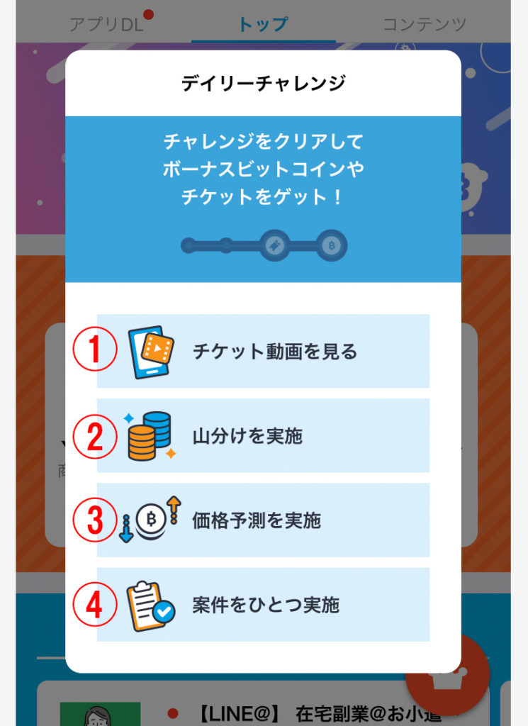 4つのデイリーミッションを毎日クリアすることで、ビットコインやビットコインを獲得できる抽選チケットをもらえます。