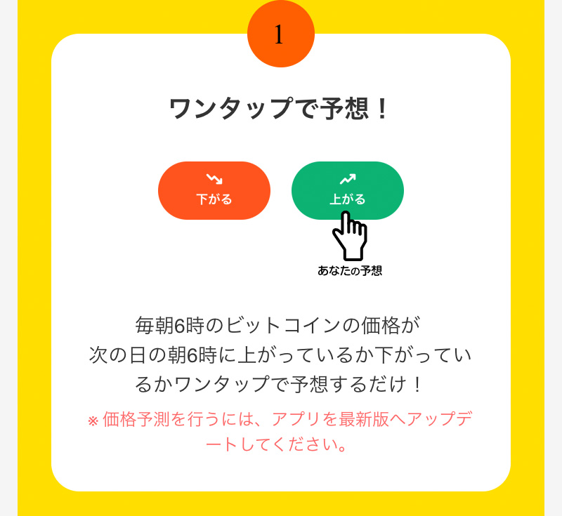 基準となるのは、その日の朝6時の時点のビットコイン価格です。そこから翌日の朝6時時点のビットコイン価格が『⇧上がる』『⇩下がる』を予想してタップします。