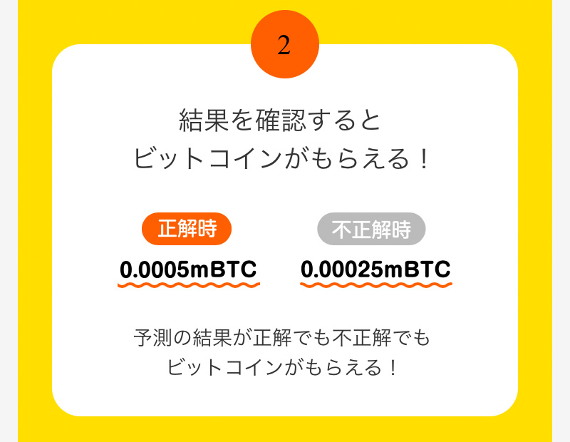 翌日予想が当たれば 0.0005mBTC 、外れても 0.00025mBTC のビットコインがもらえます。