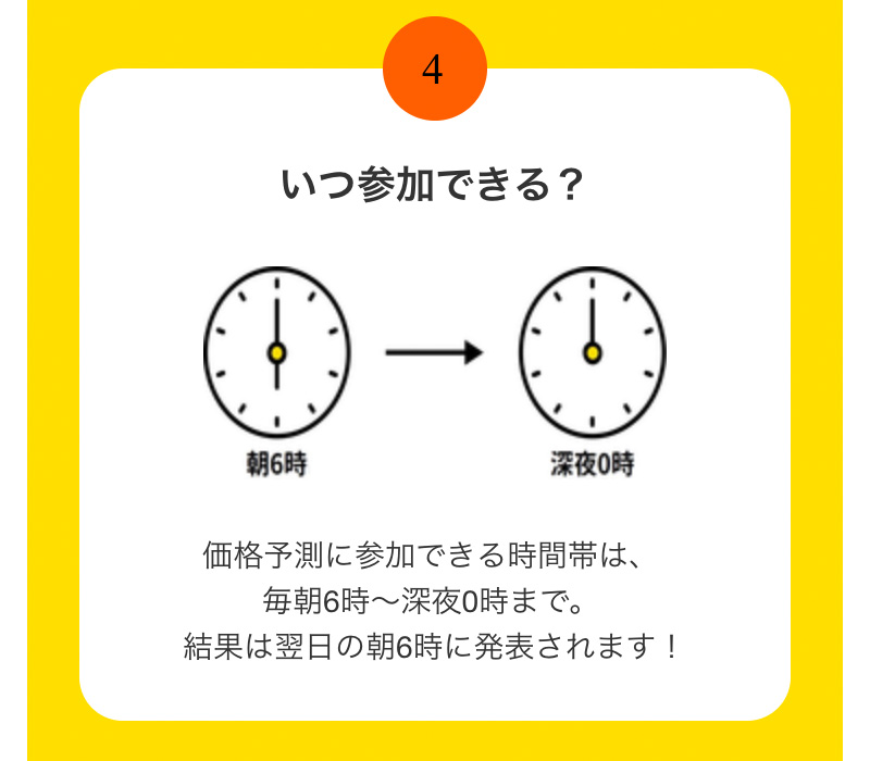 価格予想できる時間帯は、6:00~23:59 で、時間内は、何回も予想を変更することができます。