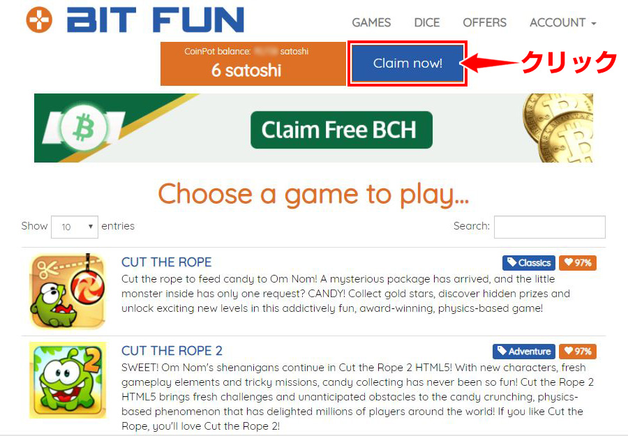 3分に1回クリックしたりゲームをする事によりBitCoinを無料で入手できます。