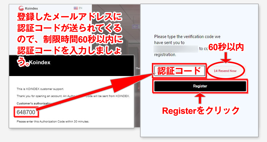 この画面に切り替わってから60秒以内に、登録したメールに届いた認証コードを入力する必要があります。