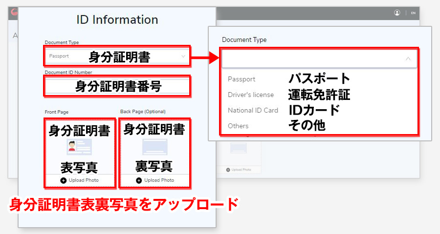 Passport(パスポート)、Driver’s licence(運転免許証)、National ID Card(IDカード)、Others(その他)から一つを選択します。