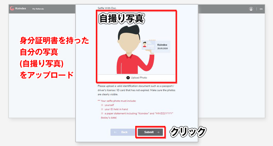 運転免許証の表(左)、運転免許証の裏(右)、「証明書+メモ書き(Koindexと申請日)を持った」本人写真をアップロードします。