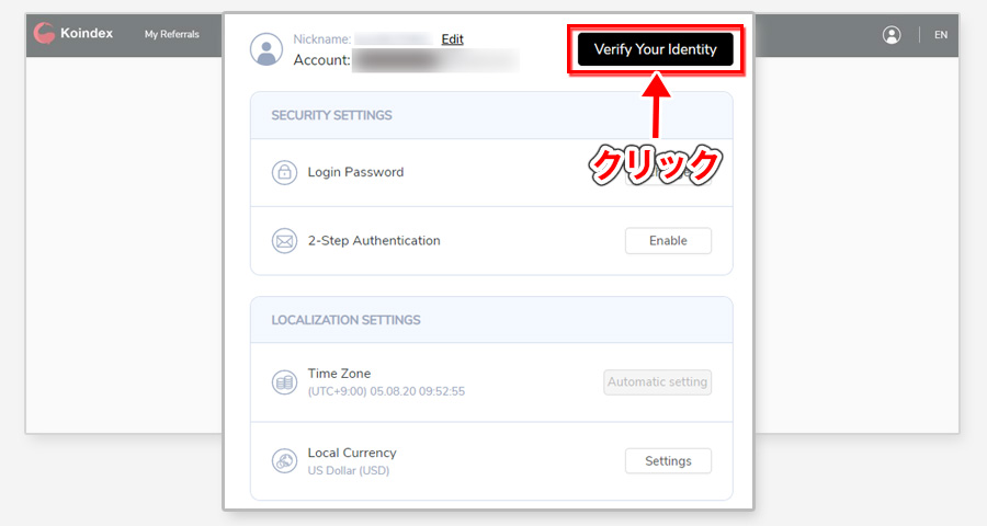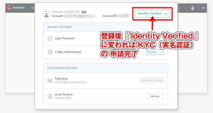 Koindexの登録、2段階認証の設定が終わったら一気にKYC(本人確認)まで済ませておきましょう。