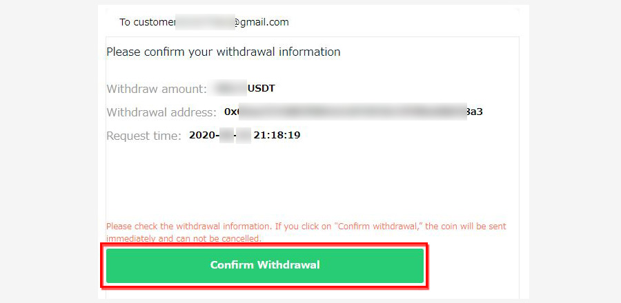 送金数量・アドレスの確認をしたら『Confirm Withdrawal』をクリック。