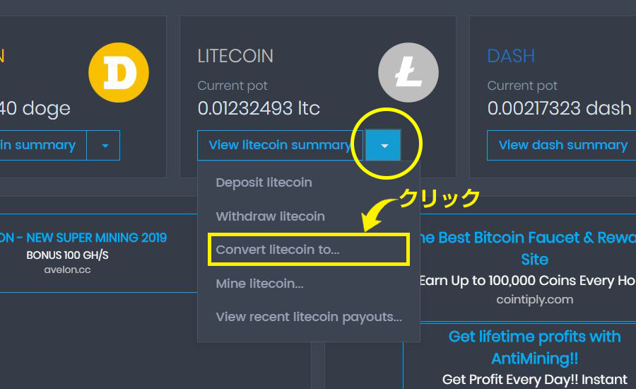 ※ この通貨を別の通貨に交換します(例はLITECOINを別の通貨に変える場合です)