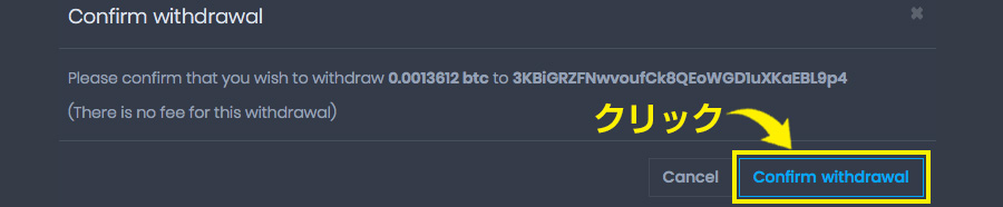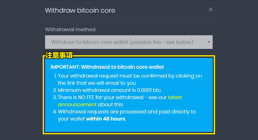 ①出金のリクエストは、あなたに送るメールのリンクをクリックすることで実行されます。 ② 最低出金額は0.0001btcです。確認画面が出てきます。「Confirm withdrawal」をクリックします。 ③ 最新のお知らせに記載のとおり、出金手数料は無料です。 ④ 出金のリクエストは、48時間以内に承認されてウォレットに送金されます。 |