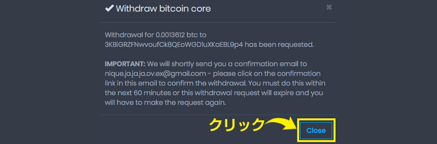 5. 出金完了画面が表示されます。「Close」をクリックします。