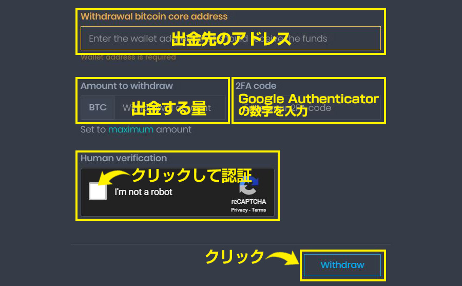 「i’m not a robot」をクリックして認証し、「Withdraw」をクリックします。